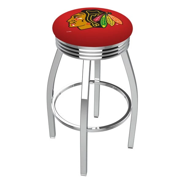 Made for the ultimate sports fan, you will be proud to show where your loyalty lies with this impressive Officially Licensed stool from the Holland Bar Stool Co. This classic L8C3C stool features a single-ring chrome base with a 2 1/2" thick cushion sitting on top of a 2.75" chrome ribbed ring that conceals the swivel for an exceptionally clean look. A state of the art print process is used in applying specially formulated UV vinyl ink in numerous stages to produce a sharp, crisp, clear image to ensure a perfect reproduction of the logo. You won't find a higher quality logo stool on the market. The frame is made from commercial quality 16 gauge, 1 1/4 inch tube steel with solid mig welded joints to guarantee strength and durability. The triple chrome plated finish resists chips and scratches and ensures a long-lasting, rich appearance. The cushion seats are of the highest quality as well, utilizing a breathable, commercial grade vinyl. At the heart of the cushion is highly-dense foam that provides maximum support and will not breakdown in a couple years. If you're going to finish your bar, game room, or man cave do it right- with a logo stool made by the Holland Bar Stool Co.