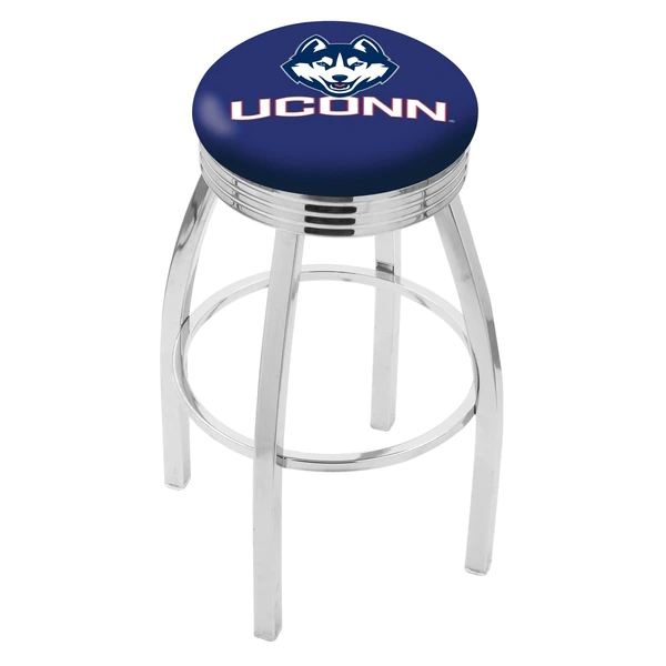 Made for the ultimate sports fan, you will be proud to show where your loyalty lies with this impressive Officially Licensed stool from the Holland Bar Stool Co. This classic L8C3C stool features a single-ring chrome base with a 2 1/2" thick cushion sitting on top of a 2.75" chrome ribbed ring that conceals the swivel for an exceptionally clean look. A state of the art print process is used in applying specially formulated UV vinyl ink in numerous stages to produce a sharp, crisp, clear image to ensure a perfect reproduction of the logo. You won't find a higher quality logo stool on the market. The frame is made from commercial quality 16 gauge, 1 1/4 inch tube steel with solid mig welded joints to guarantee strength and durability. The triple chrome plated finish resists chips and scratches and ensures a long-lasting, rich appearance. The cushion seats are of the highest quality as well, utilizing a breathable, commercial grade vinyl. At the heart of the cushion is highly-dense foam that provides maximum support and will not breakdown in a couple years. If you're going to finish your bar, game room, or man cave do it right- with a logo stool made by the Holland Bar Stool Co.