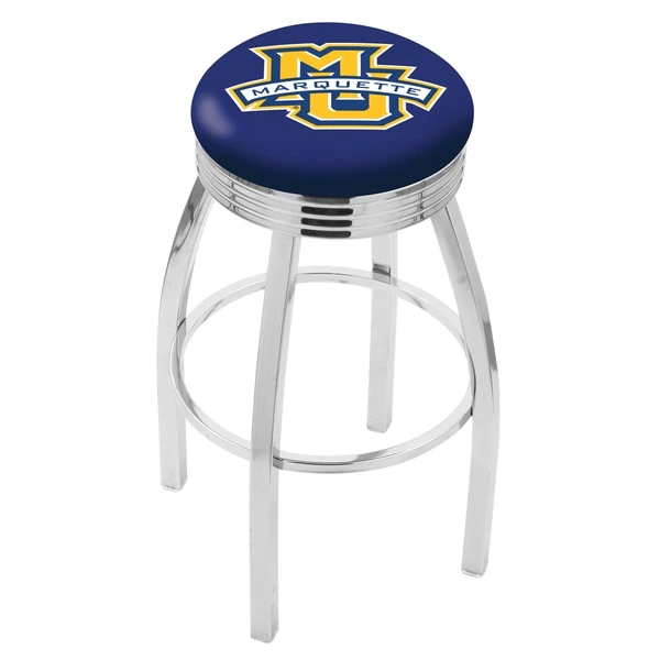 Made for the ultimate sports fan, you will be proud to show where your loyalty lies with this impressive Officially Licensed stool from the Holland Bar Stool Co. This classic L8C3C stool features a single-ring chrome base with a 2 1/2" thick cushion sitting on top of a 2.75" chrome ribbed ring that conceals the swivel for an exceptionally clean look. A state of the art print process is used in applying specially formulated UV vinyl ink in numerous stages to produce a sharp, crisp, clear image to ensure a perfect reproduction of the logo. You won't find a higher quality logo stool on the market. The frame is made from commercial quality 16 gauge, 1 1/4 inch tube steel with solid mig welded joints to guarantee strength and durability. The triple chrome plated finish resists chips and scratches and ensures a long-lasting, rich appearance. The cushion seats are of the highest quality as well, utilizing a breathable, commercial grade vinyl. At the heart of the cushion is highly-dense foam that provides maximum support and will not breakdown in a couple years. If you're going to finish your bar, game room, or man cave do it right- with a logo stool made by the Holland Bar Stool Co.