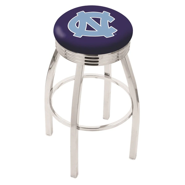 Made for the ultimate sports fan, you will be proud to show where your loyalty lies with this impressive Officially Licensed stool from the Holland Bar Stool Co. This classic L8C3C stool features a single-ring chrome base with a 2 1/2" thick cushion sitting on top of a 2.75" chrome ribbed ring that conceals the swivel for an exceptionally clean look. A state of the art print process is used in applying specially formulated UV vinyl ink in numerous stages to produce a sharp, crisp, clear image to ensure a perfect reproduction of the logo. You won't find a higher quality logo stool on the market. The frame is made from commercial quality 16 gauge, 1 1/4 inch tube steel with solid mig welded joints to guarantee strength and durability. The triple chrome plated finish resists chips and scratches and ensures a long-lasting, rich appearance. The cushion seats are of the highest quality as well, utilizing a breathable, commercial grade vinyl. At the heart of the cushion is highly-dense foam that provides maximum support and will not breakdown in a couple years. If you're going to finish your bar, game room, or man cave do it right- with a logo stool made by the Holland Bar Stool Co.