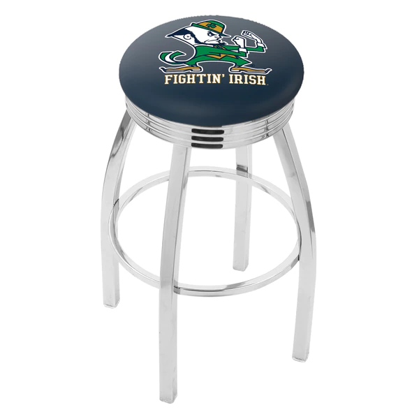 Made for the ultimate sports fan, you will be proud to show where your loyalty lies with this impressive Officially Licensed stool from the Holland Bar Stool Co. This classic L8C3C stool features a single-ring chrome base with a 2 1/2" thick cushion sitting on top of a 2.75" chrome ribbed ring that conceals the swivel for an exceptionally clean look. A state of the art print process is used in applying specially formulated UV vinyl ink in numerous stages to produce a sharp, crisp, clear image to ensure a perfect reproduction of the logo. You won't find a higher quality logo stool on the market. The frame is made from commercial quality 16 gauge, 1 1/4 inch tube steel with solid mig welded joints to guarantee strength and durability. The triple chrome plated finish resists chips and scratches and ensures a long-lasting, rich appearance. The cushion seats are of the highest quality as well, utilizing a breathable, commercial grade vinyl. At the heart of the cushion is highly-dense foam that provides maximum support and will not breakdown in a couple years. If you're going to finish your bar, game room, or man cave do it right- with a logo stool made by the Holland Bar Stool Co.