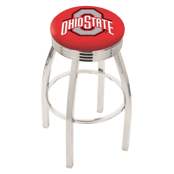 Made for the ultimate sports fan, you will be proud to show where your loyalty lies with this impressive Officially Licensed stool from the Holland Bar Stool Co. This classic L8C3C stool features a single-ring chrome base with a 2 1/2" thick cushion sitting on top of a 2.75" chrome ribbed ring that conceals the swivel for an exceptionally clean look. A state of the art print process is used in applying specially formulated UV vinyl ink in numerous stages to produce a sharp, crisp, clear image to ensure a perfect reproduction of the logo. You won't find a higher quality logo stool on the market. The frame is made from commercial quality 16 gauge, 1 1/4 inch tube steel with solid mig welded joints to guarantee strength and durability. The triple chrome plated finish resists chips and scratches and ensures a long-lasting, rich appearance. The cushion seats are of the highest quality as well, utilizing a breathable, commercial grade vinyl. At the heart of the cushion is highly-dense foam that provides maximum support and will not breakdown in a couple years. If you're going to finish your bar, game room, or man cave do it right- with a logo stool made by the Holland Bar Stool Co.