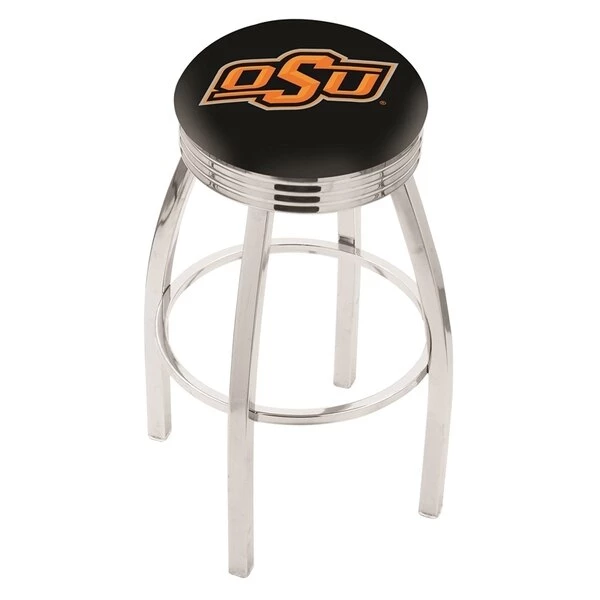 Made for the ultimate sports fan, you will be proud to show where your loyalty lies with this impressive Officially Licensed stool from the Holland Bar Stool Co. This classic L8C3C stool features a single-ring chrome base with a 2 1/2" thick cushion sitting on top of a 2.75" chrome ribbed ring that conceals the swivel for an exceptionally clean look. A state of the art print process is used in applying specially formulated UV vinyl ink in numerous stages to produce a sharp, crisp, clear image to ensure a perfect reproduction of the logo. You won't find a higher quality logo stool on the market. The frame is made from commercial quality 16 gauge, 1 1/4 inch tube steel with solid mig welded joints to guarantee strength and durability. The triple chrome plated finish resists chips and scratches and ensures a long-lasting, rich appearance. The cushion seats are of the highest quality as well, utilizing a breathable, commercial grade vinyl. At the heart of the cushion is highly-dense foam that provides maximum support and will not breakdown in a couple years. If you're going to finish your bar, game room, or man cave do it right- with a logo stool made by the Holland Bar Stool Co.