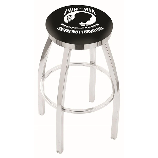 Show your support for our troops (past and present) with this impressive Officially Licensed stool from the Holland Bar Stool Co. This contemporary L8C2C swivel stool has a single-ring chrome base with a 2 1/2" thick cushion sitting on top of a 2" chrome ring that conceals the swivel for an exceptionally clean look. A state of the art print process is used in applying specially formulated UV vinyl ink in numerous stages to produce a sharp, crisp, clear image to ensure a perfect reproduction of the logo. You won't find a higher quality logo stool on the market. The frame is made from commercial quality 16 gauge, 1 1/4 inch tube steel with solid mig welded joints to guarantee strength and durability. The triple chrome plated finish resists chips and scratches and ensures a long-lasting, rich appearance. The cushion seats are of the highest quality as well, utilizing a breathable, commercial grade vinyl. At the heart of the cushion is highly-dense foam that provides maximum support and will not breakdown in a couple years. If you're going to finish your bar, game room, or man cave do it right- with a logo stool made by the Holland Bar Stool Co.