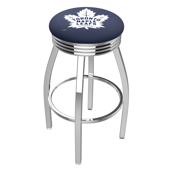 Made for the ultimate sports fan, you will be proud to show where your loyalty lies with this impressive Officially Licensed stool from the Holland Bar Stool Co. This classic L8C3C stool features a single-ring chrome base with a 2 1/2" thick cushion sitting on top of a 2.75" chrome ribbed ring that conceals the swivel for an exceptionally clean look. A state of the art print process is used in applying specially formulated UV vinyl ink in numerous stages to produce a sharp, crisp, clear image to ensure a perfect reproduction of the logo. You won't find a higher quality logo stool on the market. The frame is made from commercial quality 16 gauge, 1 1/4 inch tube steel with solid mig welded joints to guarantee strength and durability. The triple chrome plated finish resists chips and scratches and ensures a long-lasting, rich appearance. The cushion seats are of the highest quality as well, utilizing a breathable, commercial grade vinyl. At the heart of the cushion is highly-dense foam that provides maximum support and will not breakdown in a couple years. If you're going to finish your bar, game room, or man cave do it right- with a logo stool made by the Holland Bar Stool Co.