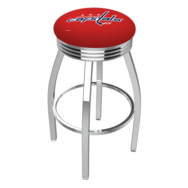 Made for the ultimate sports fan, you will be proud to show where your loyalty lies with this impressive Officially Licensed stool from the Holland Bar Stool Co. This classic L8C3C stool features a single-ring chrome base with a 2 1/2" thick cushion sitting on top of a 2.75" chrome ribbed ring that conceals the swivel for an exceptionally clean look. A state of the art print process is used in applying specially formulated UV vinyl ink in numerous stages to produce a sharp, crisp, clear image to ensure a perfect reproduction of the logo. You won't find a higher quality logo stool on the market. The frame is made from commercial quality 16 gauge, 1 1/4 inch tube steel with solid mig welded joints to guarantee strength and durability. The triple chrome plated finish resists chips and scratches and ensures a long-lasting, rich appearance. The cushion seats are of the highest quality as well, utilizing a breathable, commercial grade vinyl. At the heart of the cushion is highly-dense foam that provides maximum support and will not breakdown in a couple years. If you're going to finish your bar, game room, or man cave do it right- with a logo stool made by the Holland Bar Stool Co.