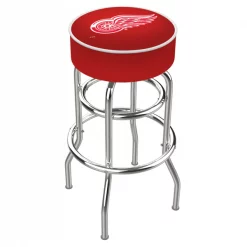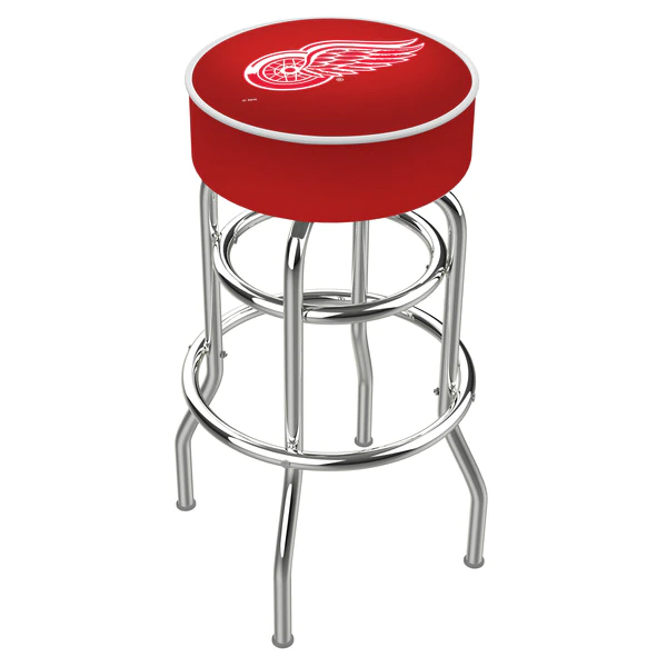 Made for the ultimate sports fan, you will be proud to show where your loyalty lies with this impressive Officially Licensed stool from the Holland Bar Stool Co. This L7C1 double ring swivel stool has a style that brings you back in time. A state of the art print process is used in applying specially formulated UV vinyl ink in numerous stages to produce a sharp, crisp, clear image to ensure a perfect reproduction of the logo. You won't find a higher quality logo stool on the market. The frame is made from commercial grade steel that is strong, durable, and triple chrome-plated to guarantee a long-lasting, rich finish capable of withstanding the abuse of your rowdiest of friends for years to come. The cushion seats are of the highest quality as well, utilizing a breathable, commercial grade vinyl. At the heart of the cushion is highly-dense foam that provides maximum support and will not breakdown in a couple years. If you're going to finish your bar, game room, or man cave do it right- with a logo stool made by the Holland Bar Stool Co.