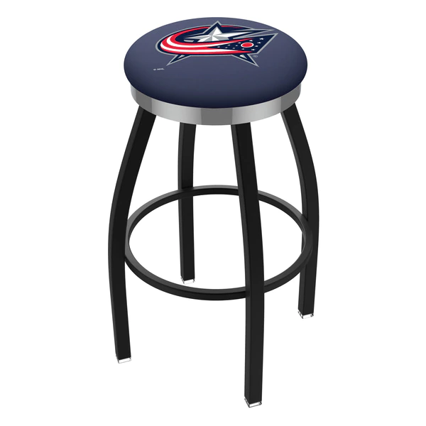Made for the ultimate sports fan, you will be proud to show where your loyalty lies with this impressive Officially Licensed stool from the Holland Bar Stool Co. This contemporary L8B2C stool has a single-ring black wrinkle base with a 2 1/2" thick cushion sitting on top of a 2" chrome ring that conceals the swivel for an exceptionally clean look. A state of the art print process is used in applying specially formulated UV vinyl ink in numerous stages to produce a sharp, crisp, clear image to ensure a perfect reproduction of the logo. You won't find a higher quality logo stool on the market. The frame is made from commercial quality 16 gauge, 1 1/4 inch tube steel with solid mig welded joints to guarantee strength and durability. The powder coated finish resists chips and scratches and ensures a long-lasting, rich appearance. The cushion seats are of the highest quality as well, utilizing a breathable, commercial grade vinyl. At the heart of the cushion is highly-dense foam that provides maximum support and will not breakdown in a couple years. If you're going to finish your bar, game room, or man cave do it right- with a logo stool made by the Holland Bar Stool Co.