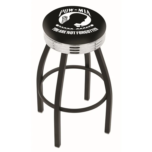Show your support for our troops (past and present) with this impressive Officially Licensed stool from the Holland Bar Stool Co. This classic L8B3C stool features a single-ring black wrinkle base with a 2 1/2" thick cushion sitting on top of a 2.75" chrome ribbed ring that conceals the swivel for an exceptionally clean look. A state of the art print process is used in applying specially formulated UV vinyl ink in numerous stages to produce a sharp, crisp, clear image to ensure a perfect reproduction of the logo. You won't find a higher quality logo stool on the market. The frame is made from commercial quality 16 gauge, 1 1/4 inch tube steel with solid mig welded joints to guarantee strength and durability. The powder coated finish resists chips and scratches and ensures a long-lasting, rich appearance. The cushion seats are of the highest quality as well, utilizing a breathable, commercial grade vinyl. At the heart of the cushion is highly-dense foam that provides maximum support and will not breakdown in a couple years. If you're going to finish your bar, game room, or man cave do it right- with a logo stool made by the Holland Bar Stool Co.