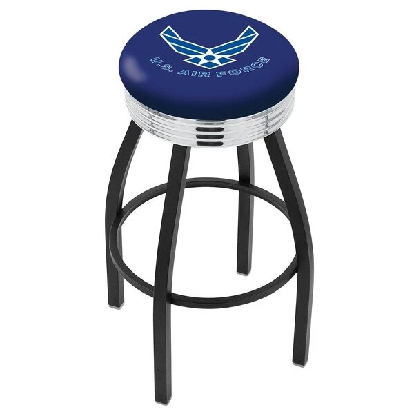 Show your support for our troops (past and present) with this impressive Officially Licensed stool from the Holland Bar Stool Co. This classic L8B3C stool features a single-ring black wrinkle base with a 2 1/2" thick cushion sitting on top of a 2.75" chrome ribbed ring that conceals the swivel for an exceptionally clean look. A state of the art print process is used in applying specially formulated UV vinyl ink in numerous stages to produce a sharp, crisp, clear image to ensure a perfect reproduction of the logo. You won't find a higher quality logo stool on the market. The frame is made from commercial quality 16 gauge, 1 1/4 inch tube steel with solid mig welded joints to guarantee strength and durability. The powder coated finish resists chips and scratches and ensures a long-lasting, rich appearance. The cushion seats are of the highest quality as well, utilizing a breathable, commercial grade vinyl. At the heart of the cushion is highly-dense foam that provides maximum support and will not breakdown in a couple years. If you're going to finish your bar, game room, or man cave do it right- with a logo stool made by the Holland Bar Stool Co.
