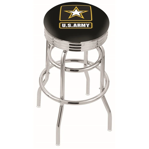 Show your support for our troops (past and present) with this impressive Officially Licensed stool from the Holland Bar Stool Co. This L7C3C double ring swivel stool has a style that brings you back in time featuring a 2.75" chrome ribbed accent ring that conceals the swivel for a very clean look. A state of the art print process is used in applying specially formulated UV vinyl ink in numerous stages to produce a sharp, crisp, clear image to ensure a perfect reproduction of the logo. You won't find a higher quality logo stool on the market. The frame is made from commercial grade steel that is strong, durable, and triple chrome-plated to guarantee a long-lasting, rich finish capable of withstanding the abuse of your rowdiest of friends for years to come. The cushion seats are of the highest quality as well, utilizing a breathable, commercial grade vinyl. At the heart of the cushion is 2 1/2 inches of highly-dense foam that provides maximum support and will not breakdown in a couple years. If you're going to finish your bar, game room, or man cave do it right- with a logo stool made by the Holland Bar Stool Co.