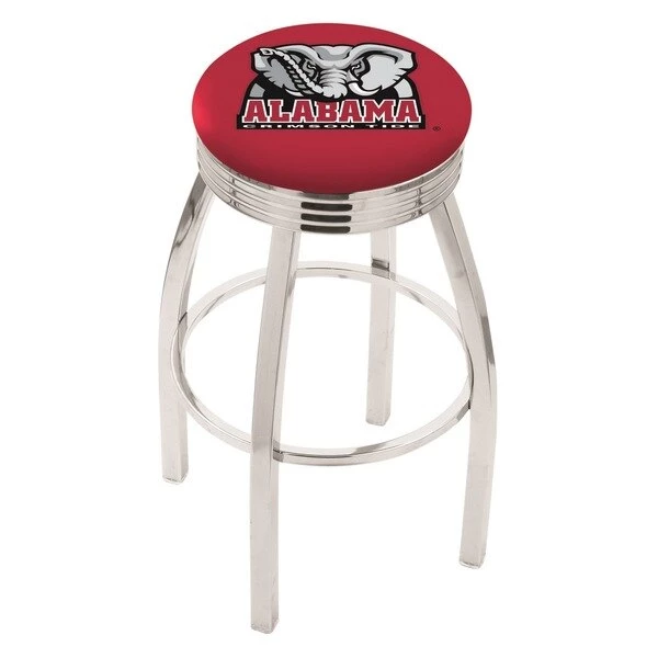 Made for the ultimate sports fan, you will be proud to show where your loyalty lies with this impressive Officially Licensed stool from the Holland Bar Stool Co. This classic L8C3C stool features a single-ring chrome base with a 2 1/2" thick cushion sitting on top of a 2.75" chrome ribbed ring that conceals the swivel for an exceptionally clean look. A state of the art print process is used in applying specially formulated UV vinyl ink in numerous stages to produce a sharp, crisp, clear image to ensure a perfect reproduction of the logo. You won't find a higher quality logo stool on the market. The frame is made from commercial quality 16 gauge, 1 1/4 inch tube steel with solid mig welded joints to guarantee strength and durability. The triple chrome plated finish resists chips and scratches and ensures a long-lasting, rich appearance. The cushion seats are of the highest quality as well, utilizing a breathable, commercial grade vinyl. At the heart of the cushion is highly-dense foam that provides maximum support and will not breakdown in a couple years. If you're going to finish your bar, game room, or man cave do it right- with a logo stool made by the Holland Bar Stool Co.