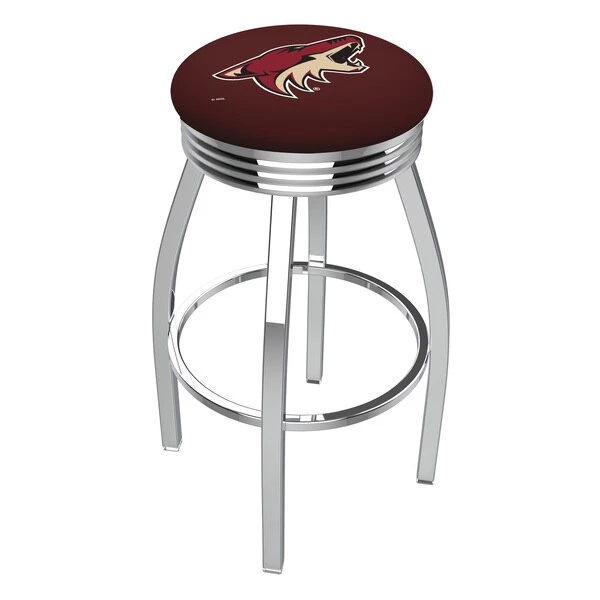 Made for the ultimate sports fan, you will be proud to show where your loyalty lies with this impressive Officially Licensed stool from the Holland Bar Stool Co. This classic L8C3C stool features a single-ring chrome base with a 2 1/2" thick cushion sitting on top of a 2.75" chrome ribbed ring that conceals the swivel for an exceptionally clean look. A state of the art print process is used in applying specially formulated UV vinyl ink in numerous stages to produce a sharp, crisp, clear image to ensure a perfect reproduction of the logo. You won't find a higher quality logo stool on the market. The frame is made from commercial quality 16 gauge, 1 1/4 inch tube steel with solid mig welded joints to guarantee strength and durability. The triple chrome plated finish resists chips and scratches and ensures a long-lasting, rich appearance. The cushion seats are of the highest quality as well, utilizing a breathable, commercial grade vinyl. At the heart of the cushion is highly-dense foam that provides maximum support and will not breakdown in a couple years. If you're going to finish your bar, game room, or man cave do it right- with a logo stool made by the Holland Bar Stool Co.