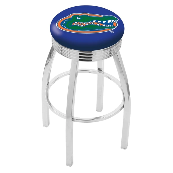 Made for the ultimate sports fan, you will be proud to show where your loyalty lies with this impressive Officially Licensed stool from the Holland Bar Stool Co. This classic L8C3C stool features a single-ring chrome base with a 2 1/2" thick cushion sitting on top of a 2.75" chrome ribbed ring that conceals the swivel for an exceptionally clean look. A state of the art print process is used in applying specially formulated UV vinyl ink in numerous stages to produce a sharp, crisp, clear image to ensure a perfect reproduction of the logo. You won't find a higher quality logo stool on the market. The frame is made from commercial quality 16 gauge, 1 1/4 inch tube steel with solid mig welded joints to guarantee strength and durability. The triple chrome plated finish resists chips and scratches and ensures a long-lasting, rich appearance. The cushion seats are of the highest quality as well, utilizing a breathable, commercial grade vinyl. At the heart of the cushion is highly-dense foam that provides maximum support and will not breakdown in a couple years. If you're going to finish your bar, game room, or man cave do it right- with a logo stool made by the Holland Bar Stool Co.