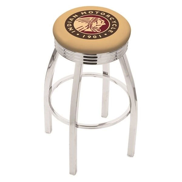 Made for the ultimate Indian Motorcycle fan, you will be proud to show where your loyalty lies with this impressive Officially Licensed stool from the Holland Bar Stool Co. This classic L8C3C stool features a single-ring chrome base with a 2 1/2" thick cushion sitting on top of a 2.75" chrome ribbed ring that conceals the swivel for an exceptionally clean look. A state of the art print process is used in applying specially formulated UV vinyl ink in numerous stages to produce a sharp, crisp, clear image to ensure a perfect reproduction of the logo. You won't find a higher quality logo stool on the market. The frame is made from commercial quality 16 gauge, 1 1/4 inch tube steel with solid mig welded joints to guarantee strength and durability. The triple chrome plated finish resists chips and scratches and ensures a long-lasting, rich appearance. The cushion seats are of the highest quality as well, utilizing a breathable, commercial grade vinyl. At the heart of the cushion is highly-dense foam that provides maximum support and will not breakdown in a couple years. If you're going to finish your bar, game room, or man cave do it right- with a logo stool made by the Holland Bar Stool Co.