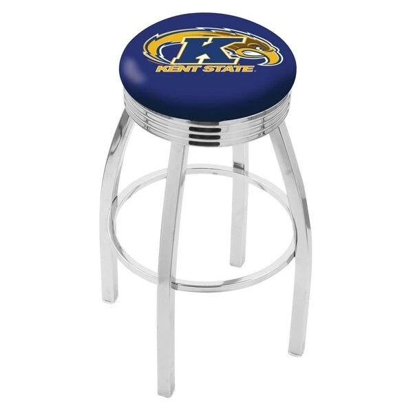 Made for the ultimate sports fan, you will be proud to show where your loyalty lies with this impressive Officially Licensed stool from the Holland Bar Stool Co. This classic L8C3C stool features a single-ring chrome base with a 2 1/2" thick cushion sitting on top of a 2.75" chrome ribbed ring that conceals the swivel for an exceptionally clean look. A state of the art print process is used in applying specially formulated UV vinyl ink in numerous stages to produce a sharp, crisp, clear image to ensure a perfect reproduction of the logo. You won't find a higher quality logo stool on the market. The frame is made from commercial quality 16 gauge, 1 1/4 inch tube steel with solid mig welded joints to guarantee strength and durability. The triple chrome plated finish resists chips and scratches and ensures a long-lasting, rich appearance. The cushion seats are of the highest quality as well, utilizing a breathable, commercial grade vinyl. At the heart of the cushion is highly-dense foam that provides maximum support and will not breakdown in a couple years. If you're going to finish your bar, game room, or man cave do it right- with a logo stool made by the Holland Bar Stool Co.
