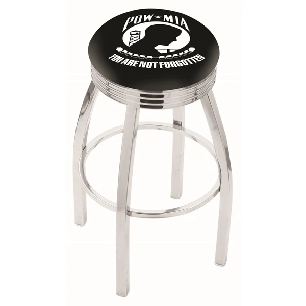 Show your support for our troops (past and present) with this impressive Officially Licensed stool from the Holland Bar Stool Co. This classic L8C3C stool features a single-ring chrome base with a 2 1/2" thick cushion sitting on top of a 2.75" chrome ribbed ring that conceals the swivel for an exceptionally clean look. A state of the art print process is used in applying specially formulated UV vinyl ink in numerous stages to produce a sharp, crisp, clear image to ensure a perfect reproduction of the logo. You won't find a higher quality logo stool on the market. The frame is made from commercial quality 16 gauge, 1 1/4 inch tube steel with solid mig welded joints to guarantee strength and durability. The triple chrome plated finish resists chips and scratches and ensures a long-lasting, rich appearance. The cushion seats are of the highest quality as well, utilizing a breathable, commercial grade vinyl. At the heart of the cushion is highly-dense foam that provides maximum support and will not breakdown in a couple years. If you're going to finish your bar, game room, or man cave do it right- with a logo stool made by the Holland Bar Stool Co.
