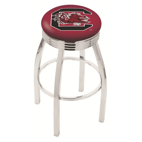 Made for the ultimate sports fan, you will be proud to show where your loyalty lies with this impressive Officially Licensed stool from the Holland Bar Stool Co. This classic L8C3C stool features a single-ring chrome base with a 2 1/2" thick cushion sitting on top of a 2.75" chrome ribbed ring that conceals the swivel for an exceptionally clean look. A state of the art print process is used in applying specially formulated UV vinyl ink in numerous stages to produce a sharp, crisp, clear image to ensure a perfect reproduction of the logo. You won't find a higher quality logo stool on the market. The frame is made from commercial quality 16 gauge, 1 1/4 inch tube steel with solid mig welded joints to guarantee strength and durability. The triple chrome plated finish resists chips and scratches and ensures a long-lasting, rich appearance. The cushion seats are of the highest quality as well, utilizing a breathable, commercial grade vinyl. At the heart of the cushion is highly-dense foam that provides maximum support and will not breakdown in a couple years. If you're going to finish your bar, game room, or man cave do it right- with a logo stool made by the Holland Bar Stool Co.