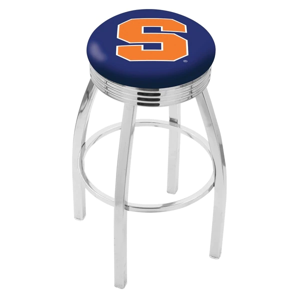 Made for the ultimate sports fan, you will be proud to show where your loyalty lies with this impressive Officially Licensed stool from the Holland Bar Stool Co. This classic L8C3C stool features a single-ring chrome base with a 2 1/2" thick cushion sitting on top of a 2.75" chrome ribbed ring that conceals the swivel for an exceptionally clean look. A state of the art print process is used in applying specially formulated UV vinyl ink in numerous stages to produce a sharp, crisp, clear image to ensure a perfect reproduction of the logo. You won't find a higher quality logo stool on the market. The frame is made from commercial quality 16 gauge, 1 1/4 inch tube steel with solid mig welded joints to guarantee strength and durability. The triple chrome plated finish resists chips and scratches and ensures a long-lasting, rich appearance. The cushion seats are of the highest quality as well, utilizing a breathable, commercial grade vinyl. At the heart of the cushion is highly-dense foam that provides maximum support and will not breakdown in a couple years. If you're going to finish your bar, game room, or man cave do it right- with a logo stool made by the Holland Bar Stool Co.