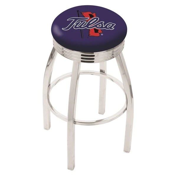 Made for the ultimate sports fan, you will be proud to show where your loyalty lies with this impressive Officially Licensed stool from the Holland Bar Stool Co. This classic L8C3C stool features a single-ring chrome base with a 2 1/2" thick cushion sitting on top of a 2.75" chrome ribbed ring that conceals the swivel for an exceptionally clean look. A state of the art print process is used in applying specially formulated UV vinyl ink in numerous stages to produce a sharp, crisp, clear image to ensure a perfect reproduction of the logo. You won't find a higher quality logo stool on the market. The frame is made from commercial quality 16 gauge, 1 1/4 inch tube steel with solid mig welded joints to guarantee strength and durability. The triple chrome plated finish resists chips and scratches and ensures a long-lasting, rich appearance. The cushion seats are of the highest quality as well, utilizing a breathable, commercial grade vinyl. At the heart of the cushion is highly-dense foam that provides maximum support and will not breakdown in a couple years. If you're going to finish your bar, game room, or man cave do it right- with a logo stool made by the Holland Bar Stool Co.