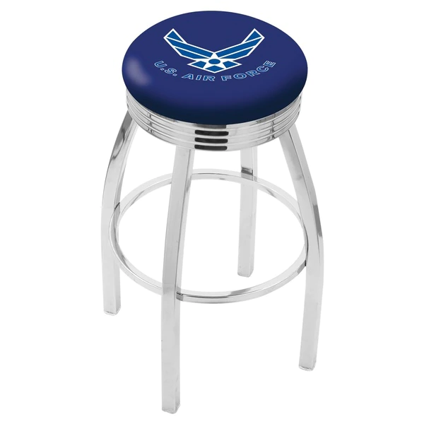 Show your support for our troops (past and present) with this impressive Officially Licensed stool from the Holland Bar Stool Co. This classic L8C3C stool features a single-ring chrome base with a 2 1/2" thick cushion sitting on top of a 2.75" chrome ribbed ring that conceals the swivel for an exceptionally clean look. A state of the art print process is used in applying specially formulated UV vinyl ink in numerous stages to produce a sharp, crisp, clear image to ensure a perfect reproduction of the logo. You won't find a higher quality logo stool on the market. The frame is made from commercial quality 16 gauge, 1 1/4 inch tube steel with solid mig welded joints to guarantee strength and durability. The triple chrome plated finish resists chips and scratches and ensures a long-lasting, rich appearance. The cushion seats are of the highest quality as well, utilizing a breathable, commercial grade vinyl. At the heart of the cushion is highly-dense foam that provides maximum support and will not breakdown in a couple years. If you're going to finish your bar, game room, or man cave do it right- with a logo stool made by the Holland Bar Stool Co.