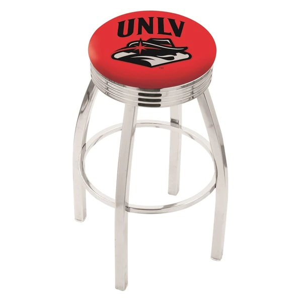 Made for the ultimate sports fan, you will be proud to show where your loyalty lies with this impressive Officially Licensed stool from the Holland Bar Stool Co. This classic L8C3C stool features a single-ring chrome base with a 2 1/2" thick cushion sitting on top of a 2.75" chrome ribbed ring that conceals the swivel for an exceptionally clean look. A state of the art print process is used in applying specially formulated UV vinyl ink in numerous stages to produce a sharp, crisp, clear image to ensure a perfect reproduction of the logo. You won't find a higher quality logo stool on the market. The frame is made from commercial quality 16 gauge, 1 1/4 inch tube steel with solid mig welded joints to guarantee strength and durability. The triple chrome plated finish resists chips and scratches and ensures a long-lasting, rich appearance. The cushion seats are of the highest quality as well, utilizing a breathable, commercial grade vinyl. At the heart of the cushion is highly-dense foam that provides maximum support and will not breakdown in a couple years. If you're going to finish your bar, game room, or man cave do it right- with a logo stool made by the Holland Bar Stool Co.