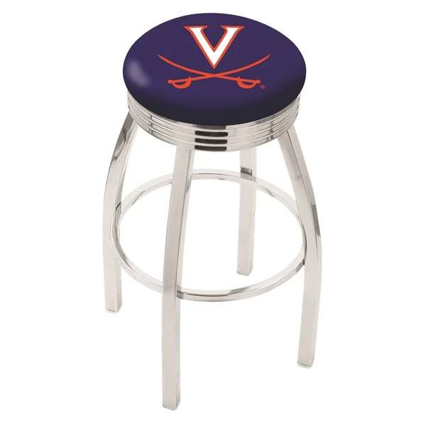 Made for the ultimate sports fan, you will be proud to show where your loyalty lies with this impressive Officially Licensed stool from the Holland Bar Stool Co. This classic L8C3C stool features a single-ring chrome base with a 2 1/2" thick cushion sitting on top of a 2.75" chrome ribbed ring that conceals the swivel for an exceptionally clean look. A state of the art print process is used in applying specially formulated UV vinyl ink in numerous stages to produce a sharp, crisp, clear image to ensure a perfect reproduction of the logo. You won't find a higher quality logo stool on the market. The frame is made from commercial quality 16 gauge, 1 1/4 inch tube steel with solid mig welded joints to guarantee strength and durability. The triple chrome plated finish resists chips and scratches and ensures a long-lasting, rich appearance. The cushion seats are of the highest quality as well, utilizing a breathable, commercial grade vinyl. At the heart of the cushion is highly-dense foam that provides maximum support and will not breakdown in a couple years. If you're going to finish your bar, game room, or man cave do it right- with a logo stool made by the Holland Bar Stool Co.
