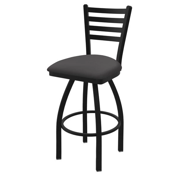 Customize your very own bar stool with the help of the Holland Bar Stool Co. This Black Wrinkle Jackie swivel bar stool has a contemporary design and provides superb back support for exceptional comfort. The frame is made from commercial quality 16 gauge, 1 1/4 inch tube steel with solid mig welded joints to guarantee strength and durability. The powder coated finish resists chips and scratches and ensures a long-lasting, rich appearance. The wood seats are 1 1/4 inch solid hardwood (oak or maple) and are dished for amazing posterior comfort, making sitting for minutes or hours a pleasure. The cushion seats are of the highest quality as well, utilizing a breathable, commercial grade vinyl or fabric. At the heart of the cushion is 2 1/2 inches of highly-dense foam that provides maximum support and will not breakdown in a couple years. You won't find a higher quality stool on the market. If you are going to finish your bar or dining area – do it right, with a stool from the Holland Bar Stool Co.