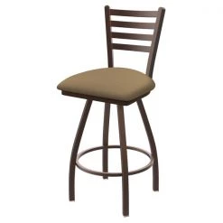 This Bronze XL Jackie swivel bar stool has a contemporary design and provides superb back support for exceptional comfort. The XL stool line from Holland Bar Stool features a larger base providing superior stability and the seat is 2" wider and 1" deeper than standard seats.The frame is made from commercial quality 16 gauge, 1 1/4 inch tube steel with solid mig welded joints to guarantee strength and durability. The powder coated finish resists chips and scratches and ensures a long-lasting, rich appearance. The wood seats are 1 1/4 inch solid hardwood (oak or maple) and are dished for amazing posterior comfort, making sitting for minutes or hours a pleasure. The cushion seats are of the highest quality as well, utilizing a breathable, commercial grade vinyl or fabric. At the heart of the cushion is 2 1/2 inches of highly-dense foam that provides maximum support and will not breakdown in a couple years. You won't find a higher quality stool on the market. If you are going to finish your bar or dining area – do it right, with a stool from the Holland Bar Stool Co.
