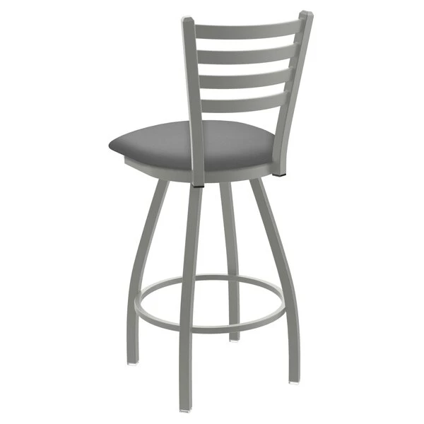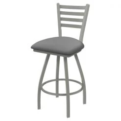 This Anodized Nickel XL Jackie swivel bar stool has a contemporary design and provides superb back support for exceptional comfort. The XL stool line from Holland Bar Stool features a larger base providing superior stability and the seat is 2" wider and 1" deeper than standard seats.The frame is made from commercial quality 16 gauge, 1 1/4 inch tube steel with solid mig welded joints to guarantee strength and durability. The powder coated finish resists chips and scratches and ensures a long-lasting, rich appearance. The wood seats are 1 1/4 inch solid hardwood (oak or maple) and are dished for amazing posterior comfort, making sitting for minutes or hours a pleasure. The cushion seats are of the highest quality as well, utilizing a breathable, commercial grade vinyl or fabric. At the heart of the cushion is 2 1/2 inches of highly-dense foam that provides maximum support and will not breakdown in a couple years. You won't find a higher quality stool on the market. If you are going to finish your bar or dining area – do it right, with a stool from the Holland Bar Stool Co.