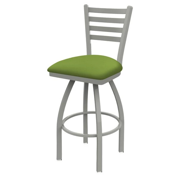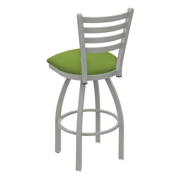 Customize your very own bar stool with the help of the Holland Bar Stool Co. This Anodized Nickel Jackie swivel bar stool has a contemporary design and provides superb back support for exceptional comfort. The frame is made from commercial quality 16 gauge, 1 1/4 inch tube steel with solid mig welded joints to guarantee strength and durability. The powder coated finish resists chips and scratches and ensures a long-lasting, rich appearance. The wood seats are 1 1/4 inch solid hardwood (oak or maple) and are dished for amazing posterior comfort, making sitting for minutes or hours a pleasure. The cushion seats are of the highest quality as well, utilizing a breathable, commercial grade vinyl or fabric. At the heart of the cushion is 2 1/2 inches of highly-dense foam that provides maximum support and will not breakdown in a couple years. You won't find a higher quality stool on the market. If you are going to finish your bar or dining area – do it right, with a stool from the Holland Bar Stool Co.