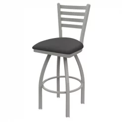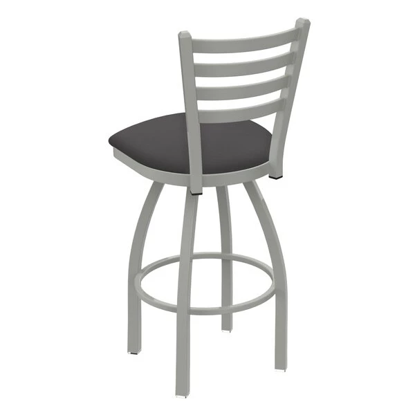Customize your very own bar stool with the help of the Holland Bar Stool Co. This Anodized Nickel Jackie swivel bar stool has a contemporary design and provides superb back support for exceptional comfort. The frame is made from commercial quality 16 gauge, 1 1/4 inch tube steel with solid mig welded joints to guarantee strength and durability. The powder coated finish resists chips and scratches and ensures a long-lasting, rich appearance. The wood seats are 1 1/4 inch solid hardwood (oak or maple) and are dished for amazing posterior comfort, making sitting for minutes or hours a pleasure. The cushion seats are of the highest quality as well, utilizing a breathable, commercial grade vinyl or fabric. At the heart of the cushion is 2 1/2 inches of highly-dense foam that provides maximum support and will not breakdown in a couple years. You won't find a higher quality stool on the market. If you are going to finish your bar or dining area – do it right, with a stool from the Holland Bar Stool Co.