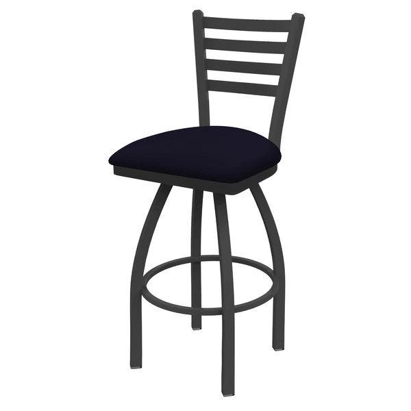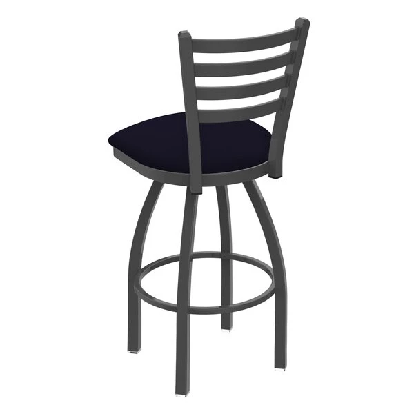 Customize your very own bar stool with the help of the Holland Bar Stool Co. This Pewter Jackie swivel bar stool has a contemporary design and provides superb back support for exceptional comfort. The frame is made from commercial quality 16 gauge, 1 1/4 inch tube steel with solid mig welded joints to guarantee strength and durability. The powder coated finish resists chips and scratches and ensures a long-lasting, rich appearance. The wood seats are 1 1/4 inch solid hardwood (oak or maple) and are dished for amazing posterior comfort, making sitting for minutes or hours a pleasure. The cushion seats are of the highest quality as well, utilizing a breathable, commercial grade vinyl or fabric. At the heart of the cushion is 2 1/2 inches of highly-dense foam that provides maximum support and will not breakdown in a couple years. You won't find a higher quality stool on the market. If you are going to finish your bar or dining area – do it right, with a stool from the Holland Bar Stool Co.