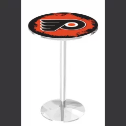 Made for the ultimate sports fan, you will be proud to show where your loyalty lies with this impressive Officially Licensed pub table from the Holland Bar Stool Co. This L214 table with round base is sure to add a touch of class to your setting. You can't find a higher quality logo table on the market. The sublimated, full color, scratch resistant, laminate top it attached with a VOC free, environmentally friendly, hot-melt adhesive. Table bases are commercial quality with a cast iron base plate, steel column, and spider. The base is triple chrome plated to ensure a rich, sleek, long lasting finish. The bases are easy to assemble and with locking tabs, top and bottom, are strong and steady. Tables have adjustable feet to accomodate any floor surface. If you're going to finish your bar, game room, or man cave – do it right with a table from the Holland Bar Stool Co.