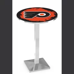 Made for the ultimate sports fan, you will be proud to show where your loyalty lies with this impressive Officially Licensed pub table from the Holland Bar Stool Co. This L217 table with square base is sure to add a touch of class to your setting. You can't find a higher quality logo table on the market. The sublimated, full color, scratch resistant, laminate top it attached with a VOC free, environmentally friendly, hot-melt adhesive. Table bases are commercial quality with a cast iron base plate, steel column, and spider. The base is triple chrome plated to ensure a rich, sleek, long lasting finish. The bases are easy to assemble and with locking tabs, top and bottom, are strong and steady. Tables have adjustable feet to accomodate any floor surface. If you're going to finish your bar, game room, or man cave – do it right with a table from the Holland Bar Stool Co.