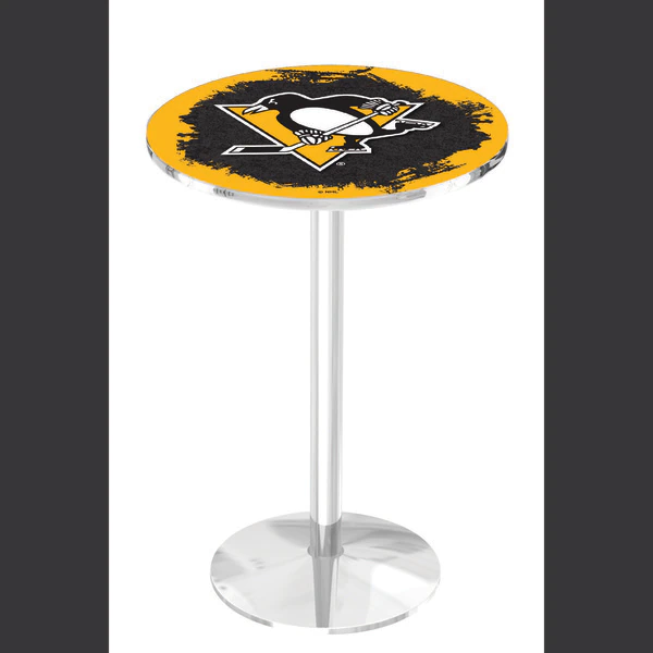 Made for the ultimate sports fan, you will be proud to show where your loyalty lies with this impressive Officially Licensed pub table from the Holland Bar Stool Co. This L214 table with round base is sure to add a touch of class to your setting. You can't find a higher quality logo table on the market. The sublimated, full color, scratch resistant, laminate top it attached with a VOC free, environmentally friendly, hot-melt adhesive. Table bases are commercial quality with a cast iron base plate, steel column, and spider. The base is triple chrome plated to ensure a rich, sleek, long lasting finish. The bases are easy to assemble and with locking tabs, top and bottom, are strong and steady. Tables have adjustable feet to accomodate any floor surface. If you're going to finish your bar, game room, or man cave – do it right with a table from the Holland Bar Stool Co.