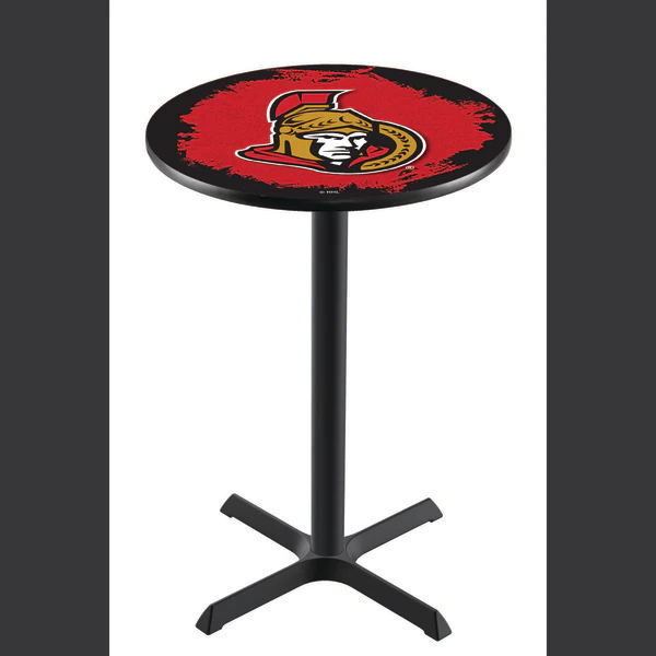 Made for the ultimate sports fan, you will be proud to show where your loyalty lies with this impressive Officially Licensed pub table from the Holland Bar Stool Co. This L211 table with cross base is sure to add a touch of class to your setting. You can't find a higher quality logo table on the market. The sublimated, full color, scratch resistant, laminate top it attached with a VOC free, environmentally friendly, hot-melt adhesive. Table bases are commercial quality with a cast iron base plate, steel column, and spider. The base is powder coated black wrinkle to ensure a rich, sleek, long lasting finish. The bases are easy to assemble and with locking tabs, top and bottom, are strong and steady. Tables have adjustable feet to accomodate any floor surface. If you're going to finish your bar, game room, or man cave – do it right with a table from the Holland Bar Stool Co.