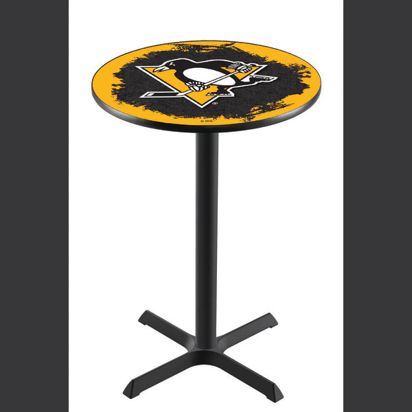 Made for the ultimate sports fan, you will be proud to show where your loyalty lies with this impressive Officially Licensed pub table from the Holland Bar Stool Co. This L211 table with cross base is sure to add a touch of class to your setting. You can't find a higher quality logo table on the market. The sublimated, full color, scratch resistant, laminate top it attached with a VOC free, environmentally friendly, hot-melt adhesive. Table bases are commercial quality with a cast iron base plate, steel column, and spider. The base is powder coated black wrinkle to ensure a rich, sleek, long lasting finish. The bases are easy to assemble and with locking tabs, top and bottom, are strong and steady. Tables have adjustable feet to accomodate any floor surface. If you're going to finish your bar, game room, or man cave – do it right with a table from the Holland Bar Stool Co.