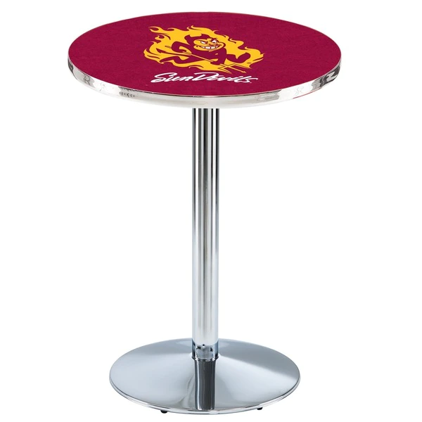 Made for the ultimate sports fan, you will be proud to show where your loyalty lies with this impressive Officially Licensed pub table from the Holland Bar Stool Co. This L214 table with round base is sure to add a touch of class to your setting. You can't find a higher quality logo table on the market. The sublimated, full color, scratch resistant, laminate top it attached with a VOC free, environmentally friendly, hot-melt adhesive. Table bases are commercial quality with a cast iron base plate, steel column, and spider. The base is triple chrome plated to ensure a rich, sleek, long lasting finish. The bases are easy to assemble and with locking tabs, top and bottom, are strong and steady. Tables have adjustable feet to accomodate any floor surface. If you're going to finish your bar, game room, or man cave – do it right with a table from the Holland Bar Stool Co.