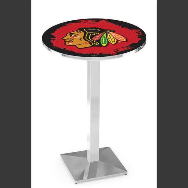 Made for the ultimate sports fan, you will be proud to show where your loyalty lies with this impressive Officially Licensed pub table from the Holland Bar Stool Co. This L217 table with square base is sure to add a touch of class to your setting. You can't find a higher quality logo table on the market. The sublimated, full color, scratch resistant, laminate top it attached with a VOC free, environmentally friendly, hot-melt adhesive. Table bases are commercial quality with a cast iron base plate, steel column, and spider. The base is triple chrome plated to ensure a rich, sleek, long lasting finish. The bases are easy to assemble and with locking tabs, top and bottom, are strong and steady. Tables have adjustable feet to accomodate any floor surface. If you're going to finish your bar, game room, or man cave – do it right with a table from the Holland Bar Stool Co.