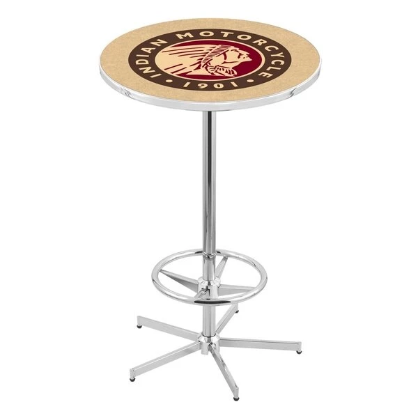 Made for the ultimate Indian Motorcycle fan, you will be proud to show where your loyalty lies with this impressive Officially Licensed pub table from the Holland Bar Stool Co. This L216 table with star base and foot ring is sure to add a touch of class to your setting. You can't find a higher quality logo table on the market. The sublimated, full color, scratch resistant, laminate top it attached with a VOC free, environmentally friendly, hot-melt adhesive. The plating grade steel used for the base ensures it will withstand the abuse of the rowdiest of friends for years to come. The base is triple chrome plated to ensure a rich, sleek, long lasting finish. Assembly is easy and quick and the outcome is an acceptionally strong, sturdy table. Adjustable floor glides make for a steady table even on an unlevel floor. If you're going to finish your bar, game room, or man cave – do it right with a table from the Holland Bar Stool Co.