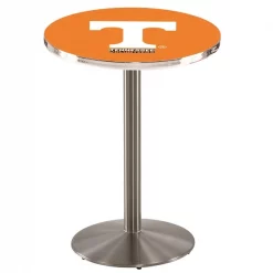Made for the ultimate sports fan, you will be proud to show where your loyalty lies with this impressive Officially Licensed pub table from the Holland Bar Stool Co. This L214 table with round base is sure to add a touch of class to your setting. You can't find a higher quality logo table on the market. The sublimated, full color, scratch resistant, laminate top it attached with a VOC free, environmentally friendly, hot-melt adhesive. Table bases are commercial quality with a cast iron base plate, steel column, and spider. The base is a 304 Stainless Steel that will look great no matter where you put it. The bases are easy to assemble and with locking tabs, top and bottom, are strong and steady. Tables have adjustable feet to accomodate any floor surface. If you're going to finish your bar, game room, or man cave – do it right with a table from the Holland Bar Stool Co.