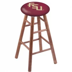 Made for the ultimate sports fan, you will be proud to show where your loyalty lies with this impressive Officially Licensed stool from the Holland Bar Stool Co. You won't find a higher quality logo stool on the market. This logo swivel height stool is very versatile and built from the very highest quality U.S. sourced, solid oak or maple. A state of the art print process is used in applying specially formulated UV vinyl ink in numerous stages to produce a sharp, crisp, clear image to ensure a perfect reproduction of the logo. The legs are a full 1 3⁄4” thick and the stretchers are 1” thick. The way the base is constructed is second to none. The joints are secured with both epoxy glue and screws to ensure the highest strength and quality for any application. The 52 ball bearing swivel eliminates any unnecessary torque on the joints, so your base will not “wobble” like lesser quality wood seating. The 14 1⁄2” wide cushion seats are of the highest quality as well, utilizing a breathable, commercial grade vinyl or fabric. At the heart of the cushion is 2 1/2 inches of highly-dense foam that provides maximum support and will not breakdown in a couple years. A multi step finishing process ensures a durable, great looking finish for years to come. If you are in the market for a cool, Officially Licensed logo stool – do it right, with help from the Holland Bar Stool Co.