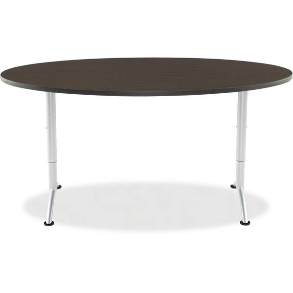 Multipurpose Table, Surface Material Thermal Fused Melamine Laminate, Oval, Width 72 in, Depth 36 in, Height 30 in to 42 in, Tabletop Color Family Woodgrain, Tabletop Color Gray Walnut, Frame Color Silver, Assembled/Unassembled Unassembled, Frame Material Steel, Edge Color Gray, Edge Type T-Molded, Leg Type Steel Tubular Legs with Arched Base, Top Thickness 1 1/8 in, Series ARC, Load Rating 200 lb, Features Adjusts in 3 in Increments, Spring Button Clips, Standards ANSI/BIFMA