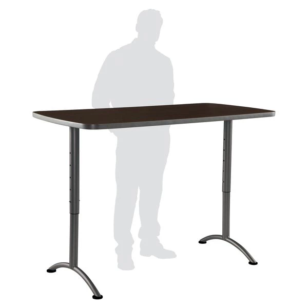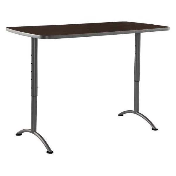 Multipurpose Table, Surface Material Thermal Fused Melamine Laminate, Rectangle, Width 60 in, Depth 30 in, Height 30 in to 42 in, Tabletop Color Family Woodgrain, Tabletop Color Walnut, Frame Color Silver, Assembled/Unassembled Unassembled, Frame Material Steel, Edge Color Gray, Edge Type T-Molded, Leg Type Steel Tubular Legs with Arched Base, Top Thickness 1 1/8 in, Series ARC, Load Rating 200 lb, Features Adjusts in 3 in Increments, Spring Button Clips, Standards ANSI/BIFMA