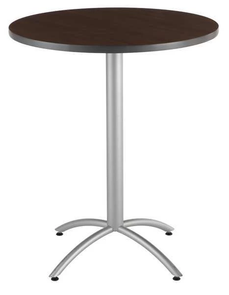 Bistro Table, Surface Material Laminated Melamine, Shape Round, Diameter 36 in, Height 42 in, Tabletop Color Family Woodgrain, Tabletop Color Walnut, Frame Color Silver, Assembled/Unassembled Unassembled, Frame Material Steel, Edge Type T-Molded, Edge Color Gray, Base Type (4) Legs Attached to Pedestal, Leg Type Arched, Top Thickness 1 1/8 in, Load Rating 250 lb, Series CafeWorks, Includes (4) Leveling Glides