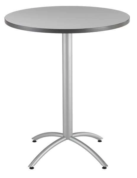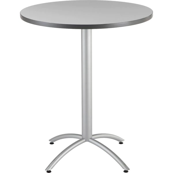 Bistro Table, Surface Material Laminated Melamine, Shape Round, Diameter 36 in, Height 42 in, Tabletop Color Family Gray, Tabletop Color Gray, Frame Color Silver, Assembled/Unassembled Unassembled, Frame Material Steel, Edge Type T-Molded, Edge Color Gray, Base Type (4) Legs Attached to Pedestal, Leg Type Arched, Top Thickness 1 1/8 in, Load Rating 250 lb, Series CafeWorks, Includes (4) Leveling Glides