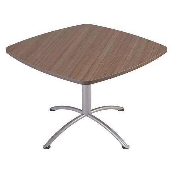 Cafe Table, Surface Material Laminated Melamine, Shape Square, Width 42 in, Depth 42 in, Height 30 in, Tabletop Color Family Woodgrain, Tabletop Color Natural Teak, Frame Color Silver, Assembled/Unassembled Unassembled, Frame Material Steel, Edge Type Banded, Edge Color Gray, Base Type (4) Legs Attached to Pedestal, Leg Type Arched, Top Thickness 1 1/8 in, Load Rating 250 lb, Series iLand, Includes (4) Leveling Glides