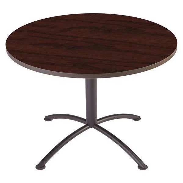 Cafe Table, Surface Material Laminated Melamine, Shape Round, Diameter 42 in, Height 30 in, Tabletop Color Family Woodgrain, Tabletop Color Mahogany, Frame Color Charcoal, Assembled/Unassembled Unassembled, Frame Material Steel, Edge Type Banded, Edge Color Gray, Base Type (4) Legs Attached to Pedestal, Leg Type Arched, Top Thickness 1 1/8 in, Load Rating 250 lb, Series iLand, Includes (4) Leveling Glides