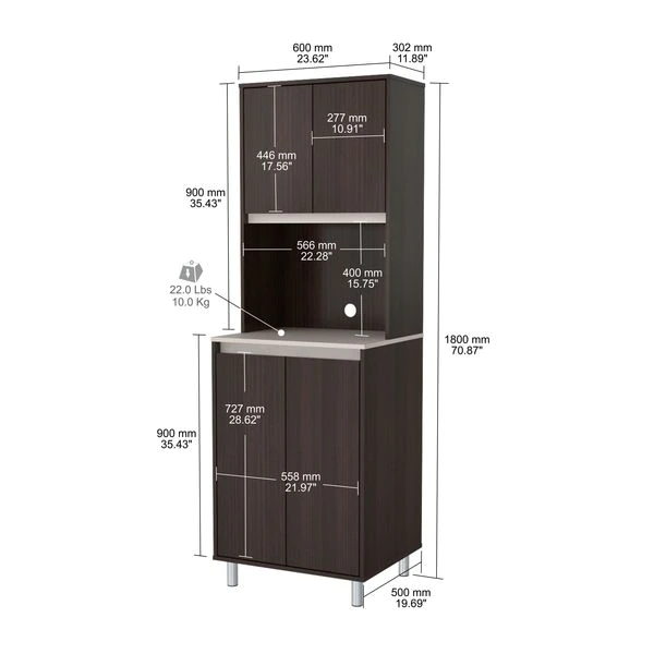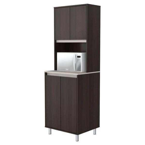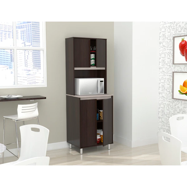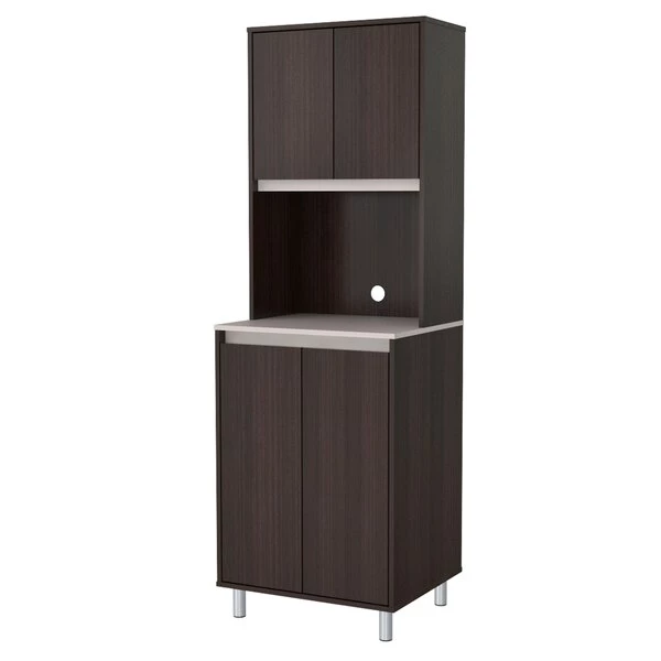 AMBROSSIATM Coffee Station Cabinet by Inval® finished in a rich “Espresso/Ambar” laminates in durable melamine which is stain, heat and scratch resistant. Constructed from manufactured wood. Features a functional modern design that is an excellent choice for your home or office break room. It includes two (2) top doors and two (2) bottom doors both mounted with concealed European hinges. These storage areas have adjustable shelves for easy storage of all your coffee/lunch room needs. The large work area with the convenient pass-through cable is ideal for your microwave and/or coffee maker. The unit is conveniently equipped with adjustable, easy to level feet. Our unit is equipped with anti-tilt hardware.